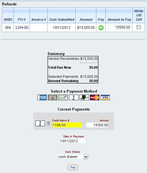 Click the green arrow next to your refund amount and then click the “Credit Memo” icon in the list of payment options below. Enter a credit memo number, if desired. Finally, select a cash drawer and click the “Pay” button.