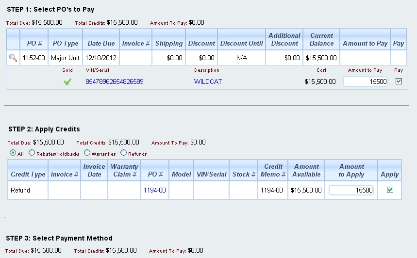 Next, locate the PO in question and check the “Pay” box next to the applicable unit(s). If you refunded the freight cost as well, then also add the appropriate amount in the “Non-Unit Total” field. After that, scroll down to the “Apply Credits” section, locate the credit we created in step 2, and click the checkbox to apply it. Finally, scroll down to the bottom and “pay” the payable, which should be at $0.00 if you have done all this correctly.