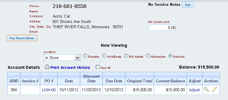 First, locate the supplier in Contacts. From there, go to Accounting → Receivables → View Current Contact A/R. Next, click on “Refunds”. You should see your refund PO listed there along with the amount of the refund. Now, click the “Pay Receivables” button. This will take you to the payment form.