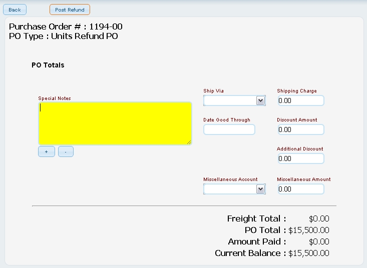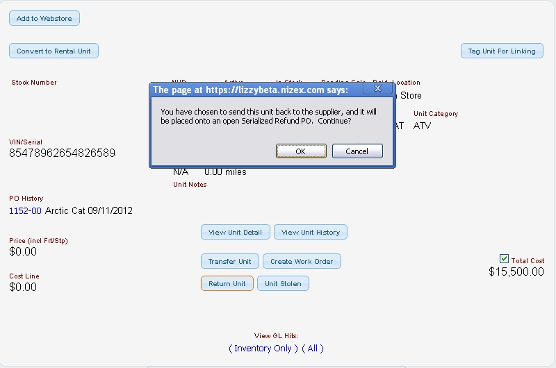 Step 1: Returning the Unit: To begin this process, locate the unit in question and click the “Return” button. Choose the “Refund Freight Cost Too” option, if desired. This will place the unit on a Serialized Refund PO.