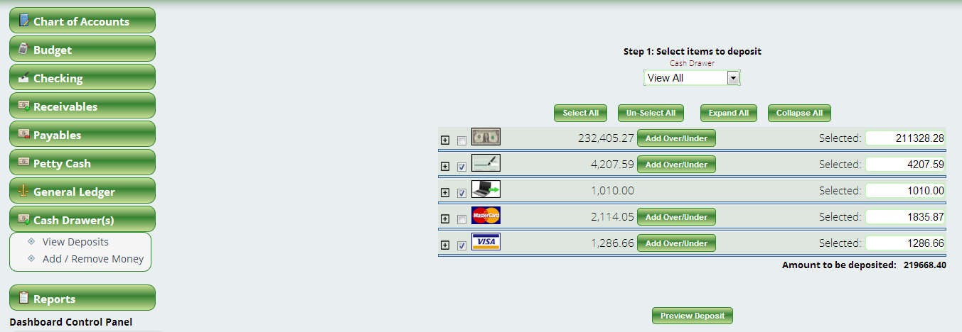 The Cash Drawer is a holding tank. This holding tank is where all the cash, checks and credit cards are held until you tell Lizzy you are moving these to the checkbook. The funds come from Invoice payments and Receivable payments.