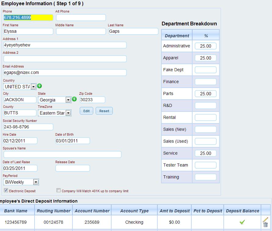 3. Go to Settings > Payroll > Employee. When setting up Employees, select Direct Deposit option on Step 1. Fill in their bank information here. You can add more than 1 line item here if they want to split their paycheck between multiple accounts, etc.