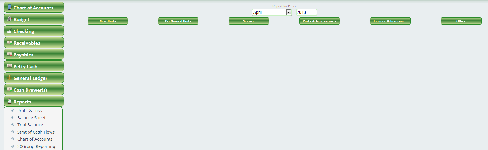 Here at nizeX we’ve seen many of our customers who joined 20 Groups become more profitable and intelligent about their businesses than those that don’t participate. There is a special 20 Group report within Lizzy that allows dealers to view their financial information necessary to submit as a member. You can view this report at Reports > Accounting General > 20 Group Reporting. Choose the department you wish to view: New Units, Preowned Units, Service, Parts and Accessories, Finance and Insurance, or Other.