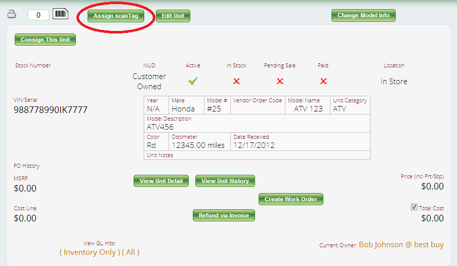 Now you can begin linking units to their individual scanTags. To do so, go to Serialized > Units > Locate a Unit. You can use the drill-down features to locate the units you want to tag. Once you have clicked on an individual unit, locate the green button that says “Assign scanTag.”