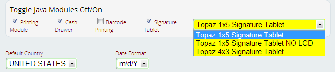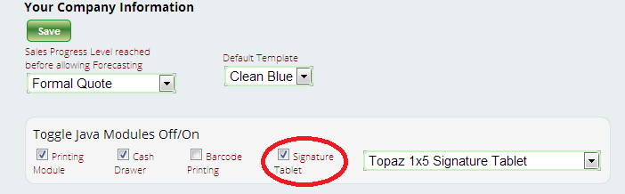 5) Finally, go to Settings > General > Company Info. Select the checkbox for “Signature Tablet” under the header “Toggle Java Modules Off/On.”