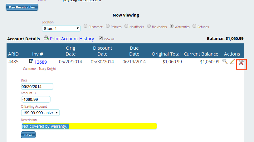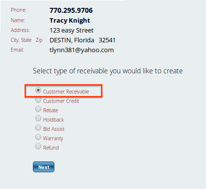 2) Locate the customer in Receivables, and then click on New Receivable and enter a New Customer Receivable.