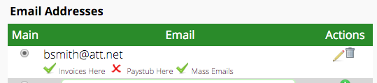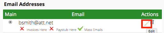 Once we click on the pencil beside Bob’s name, we’ll have the option to edit all of the information for his record. We’re concerned only with his email address, however, so click on the pencil next to his email address. (Note: if there were multiple emails for Bob, we’d want to be sure we’re choosing the correct one to email the invoices to.)