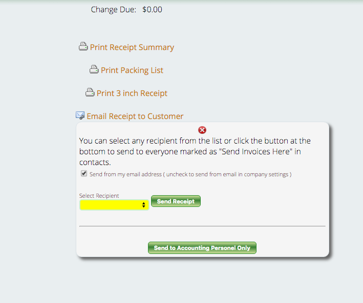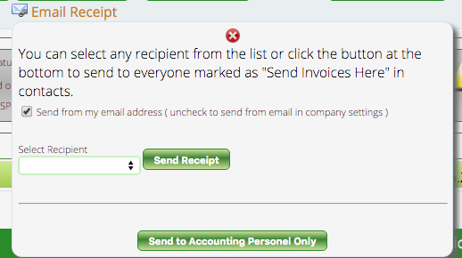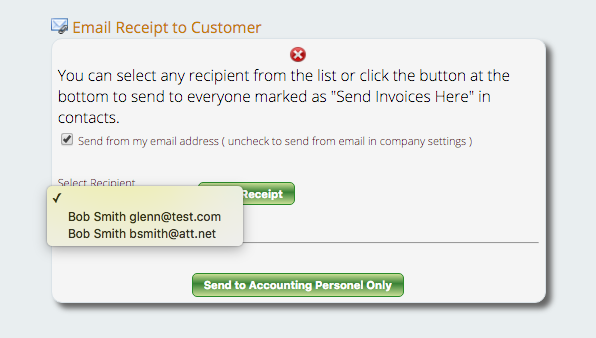For customers that have more than one address on file, when you click the “Email Receipt to Customer” button, it will open a window that allows you to select a specific email address to send the invoice to. When you click on the drop down area under “Select Recipient,” all the email addresses linked to that contact’s record will show up, allowing you to choose which email address you want to send the invoice to.