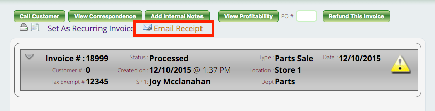 You can still print or email customers their invoices long after you’ve processed the sale. Simply locate the invoice you’d like to print or email (Invoicing > General Invoices > Locate Invoice) and select it using the magnifying glass. Once you’ve opened the processed invoice, there will be an “Email Receipt” link above the header of the invoice.