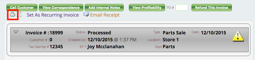 Printing: if you need to reprint an invoice instead of (or in addition to) emailing, simply select the Printer icon above the invoice header (under the “Call Customer” button).