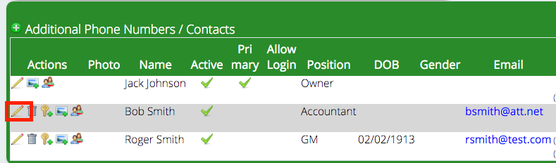 First, we’ll select the additional contact that we want to always receive copies of processed invoices. (Notice that in this example that the owner, Jack, is set as the primary contact. We won’t need to set up anything for him to receive copies of invoices automatically.) Click on the pencil beside the additional contact you need to change. In this case, we’re selecting Bob Smith.