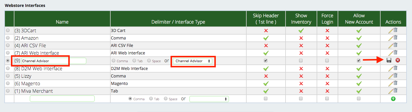 - Add Channel Advisor as an interface. Under the Delimiter heading, choose Channel Advisor from the drop down menu. SAVE.