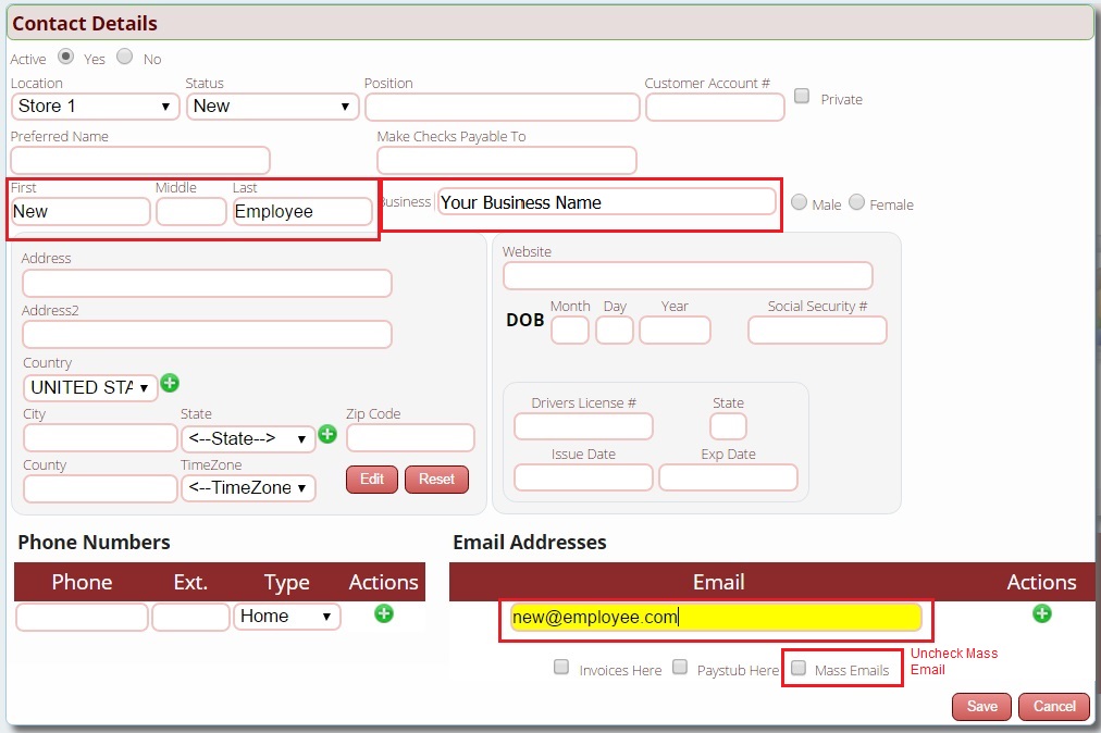 Step # 2: Enter any information not already filled in, such as your business name (entering the business name helps later when searching for employees) and the employee’s email address. When entering the email address, you may wish to uncheck Mass Email to avoid sending marketing/sales emails to your employee when you send them to customers. You can enter any other information that you have for them now (phone number, address, etc) or you may go back and enter it later once you have it. Click save once done.