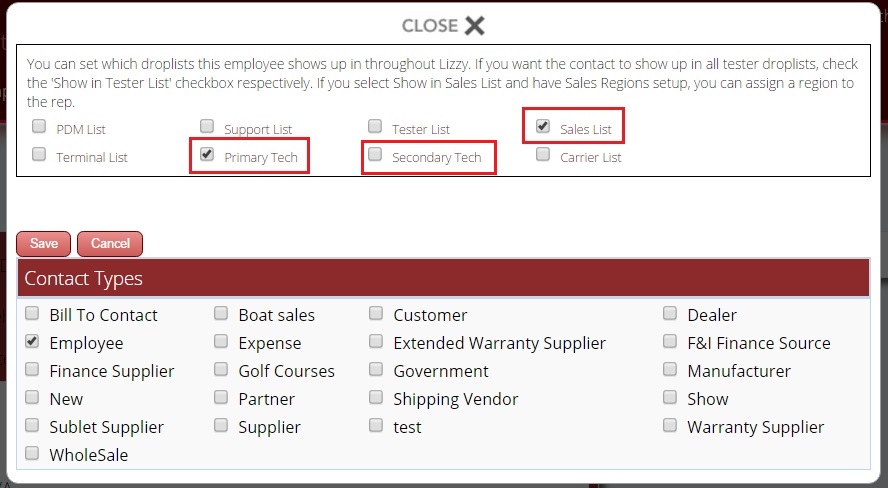 Check that they are an Employee. (If they are not also a customer, you can uncheck that option.) Once you select that they are an Employee, a box will open with some other options. Here you can set them as a Primary Tech or a Secondary Tech if they are a mechanic. If they are a salesperson, check the Sales List option instead. Click save when done.