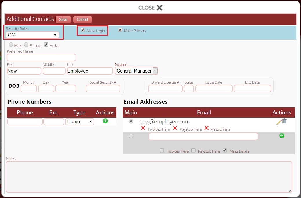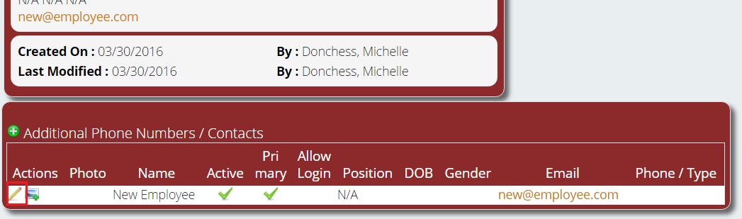 Step # 4: You will also need to assign the employee a security role and set them to login. To do this, go to Additional Phone Numbers / Contacts and click on the pencil next to the employee’s name.