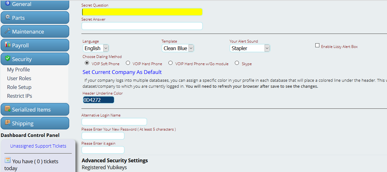 Step #5: Once the new employee gets their password via email, they can login. Their login is automatically set to be the email address you entered for them in Step #2. They can change their password and login info under Settings > Security > My Profile. They can also put in a secret question and answer in case they forget their new password. The Alternate Login name must be at least 3 characters and unique. The password must be at least 5 characters (it can be all letters, numbers, symbols or a combination of all of them). Save when done.