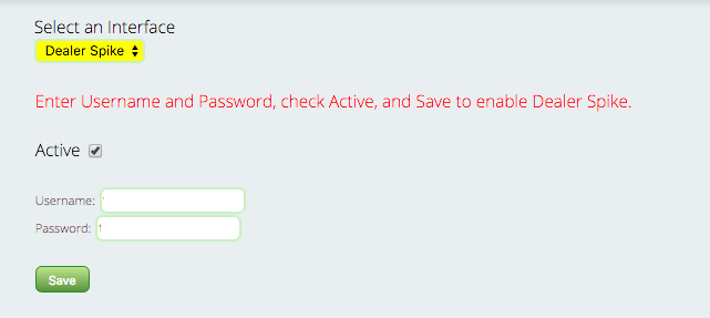 Simply go to Settings > General > Manufacturer Interfaces and select Dealer Spike from the drop down menu. Check the Active checkbox, and then enter your username and password. Be sure to save!